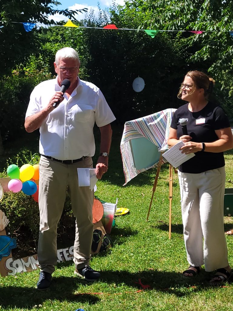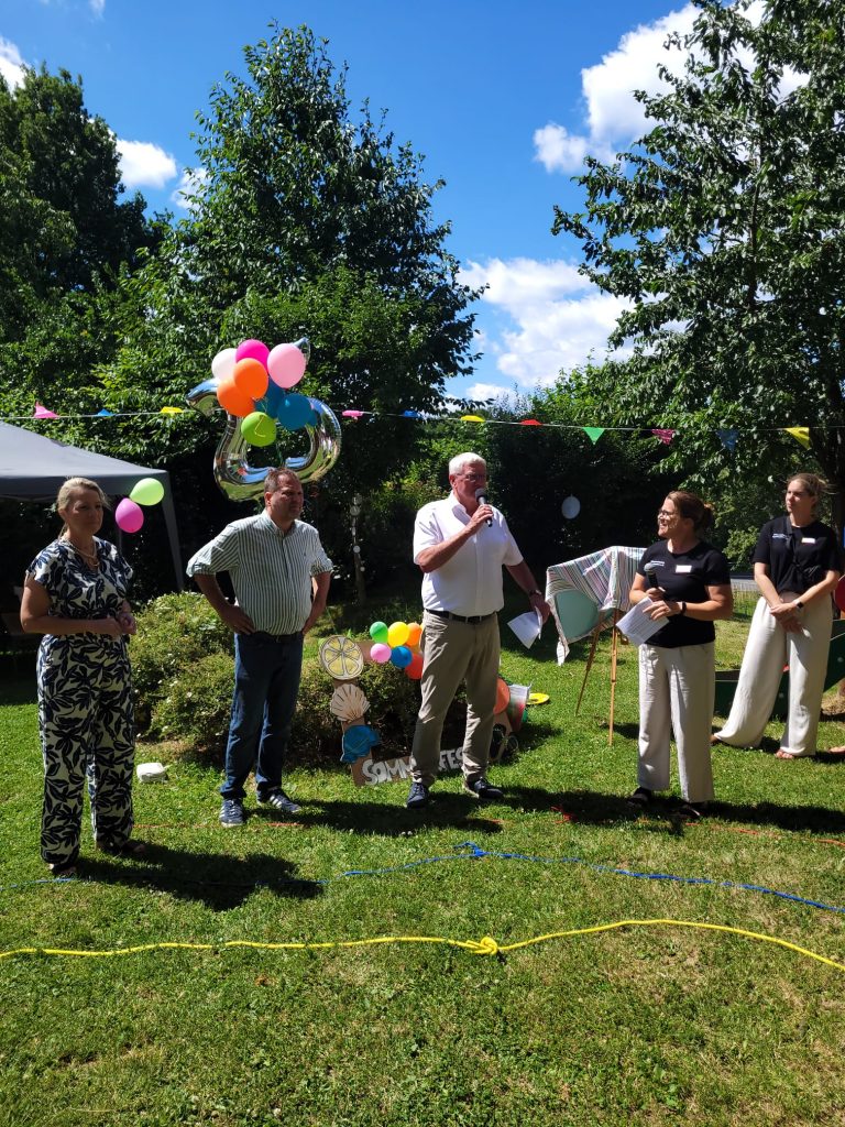 Wir durften uns über Grußworte von Landrat Sebastian Schuster, Bürgermeister Lutz Wagner und Sozialdezernentin Heike Jüngling freuen. Besonders groß war unsere Freude über den mitgebrachten Förderbescheid in Höhe von 1.000 Euro, den Landrat Schuster in seiner Funktion als Vorsitzender des Kuratoriums der Sparkassenstiftung „Für uns Pänz“ überreichte. Mit dieser Unterstützung können wir unseren Bauraum neu und kindgerecht gestalten – ein herzliches Dankeschön!